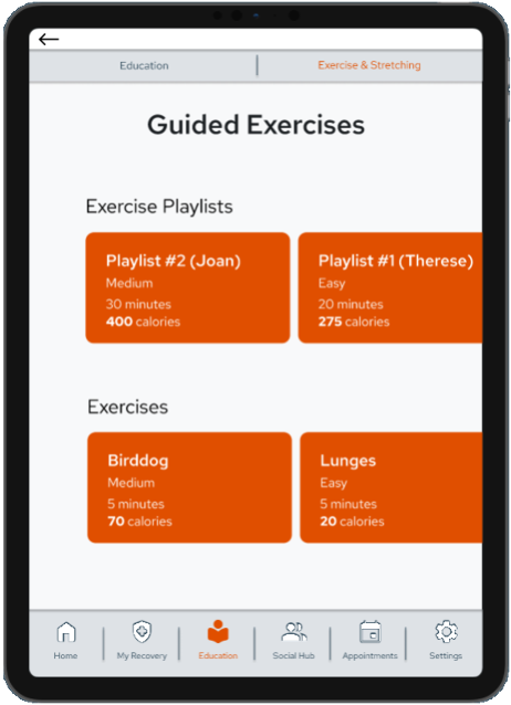 Patients can complete home exercises on their own, using curated playlists with voice overs from specific Hearth Health instructors.