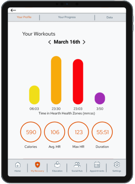Patients can track their progress through Hearth Health, seeing their exercise time in different exertion levels as part of post workout reports.