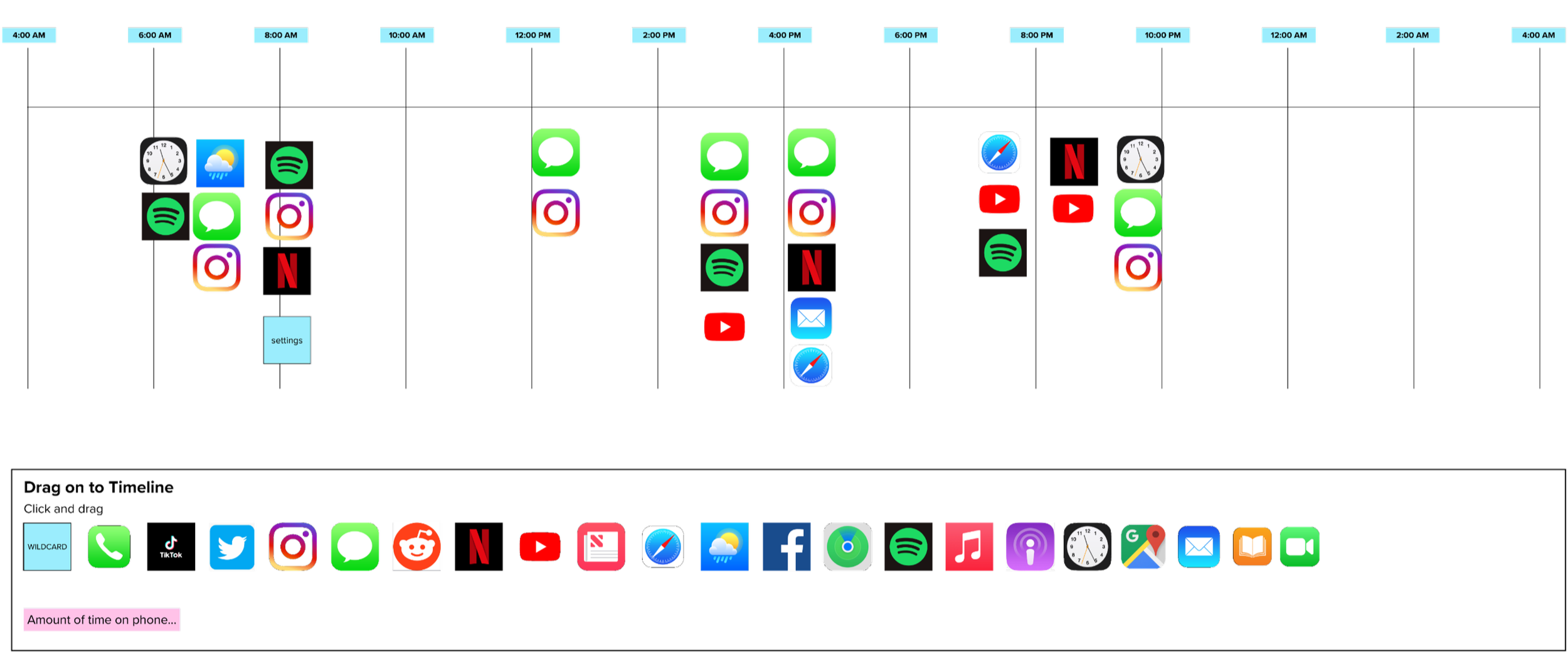 Around the same time, I began primary user interviews, interviewing people about their phone usage habits. I focused most of my research on teens and younger adults, with some outliers at higher ages. I asked them to create timelines of their day based on what apps they use when, then asked them to live react to their screen time data. I followed up with questions to get them to reflect on their phone usage, and their overarching desires (if at all) for changing their cell phone usage.
