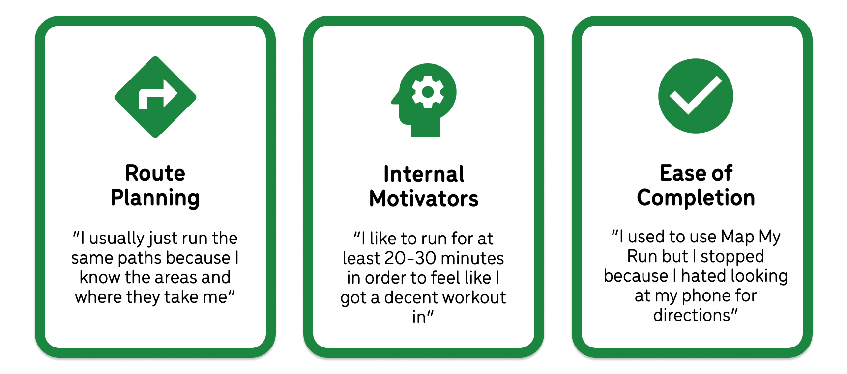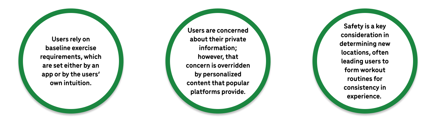 We interviewed eight different users with a range of different exercise routines to understand how they interact with exercise apps and how they approach their exercise habits. We wanted to understand what they are thinking about before, during, and after a workout. Ultimately, we identified three key insights which guided our next steps: