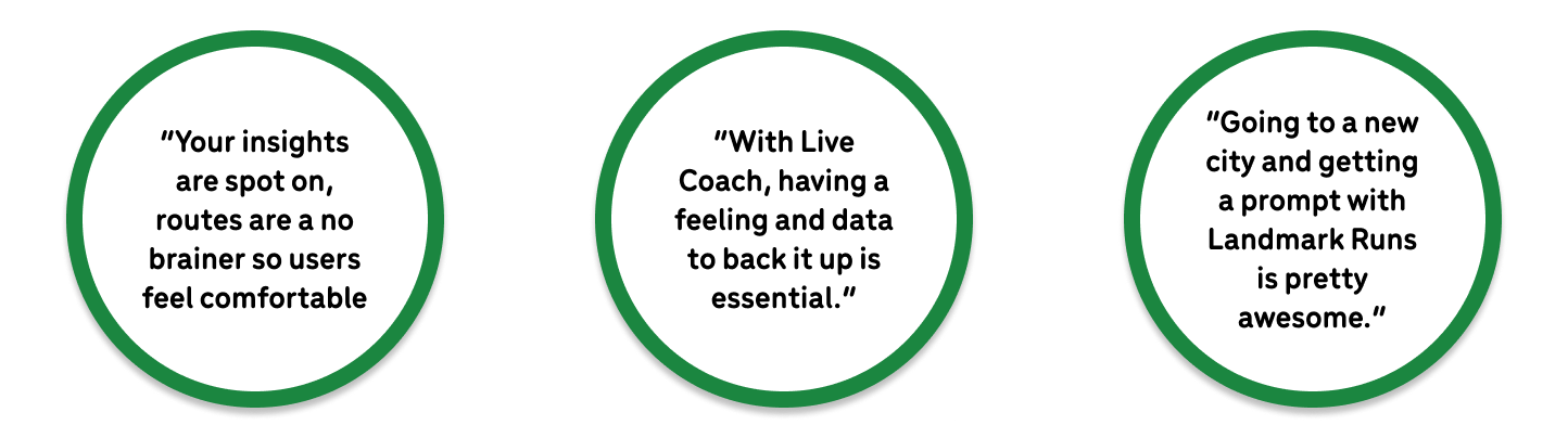 Our first new feature, Coach, is an enhancement of Nike Run Club’s existing in-ear guidance. We heard from users that the existing guidance system feels robotic and predetermined, meaning that it is not specified enough to each run. Coach gives user live, personalized feedback based on detailed acceleration and location data processed by Arity’s SDK to motivate users on their runs and help them achieve their long-term running goals.